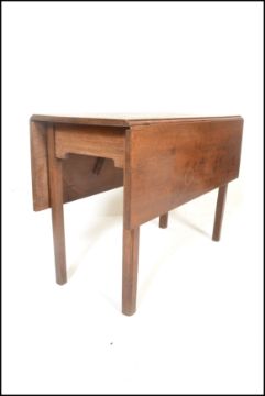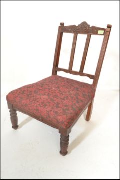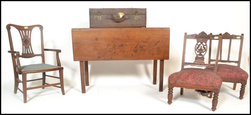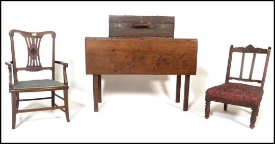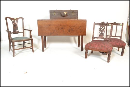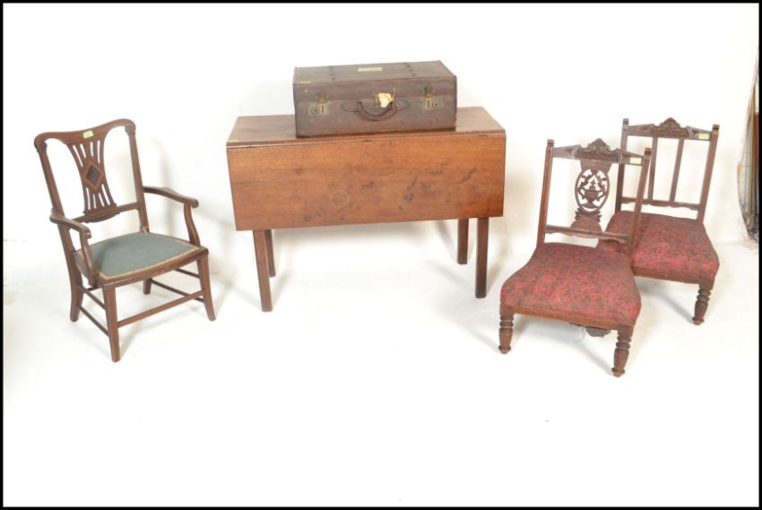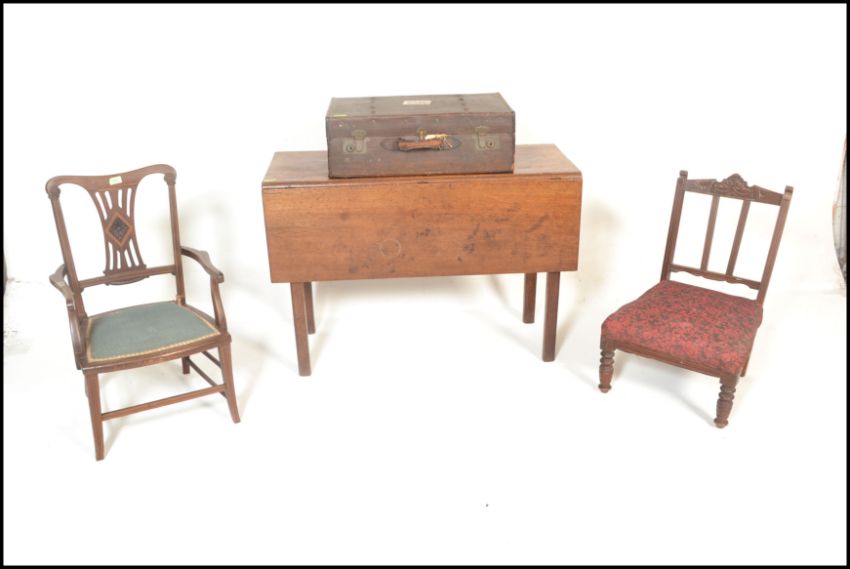An Edwardian mahogany inlaid bedroom nursing chair with scrolled elbow supports. Together with a pair of nursing chairs, a 19th century mahogany George III drop leaf table together with a suitcase. Measures 73cm high x 105cm wide x 49cm depth.