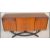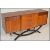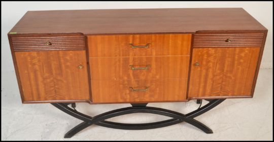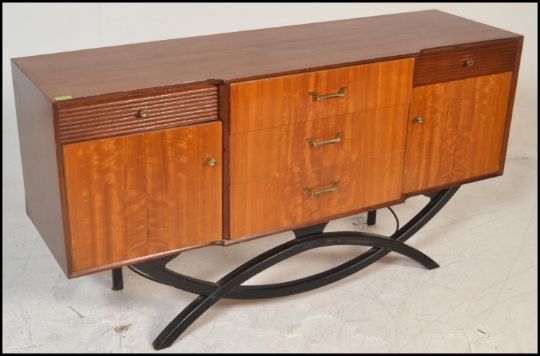 A mid 20th Century teak wood sideboard / credenza, central bank of three drawers flanked by cupboards under a single drawer, raised on ebonised cross over supports. Measures 80H x 152W x 46D.