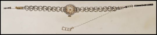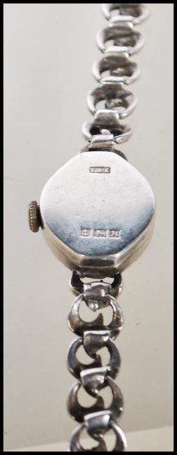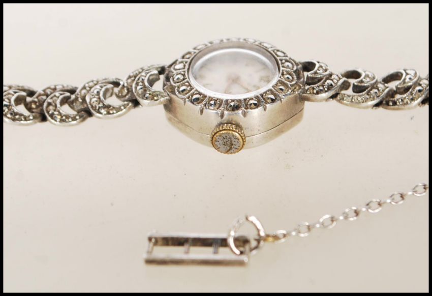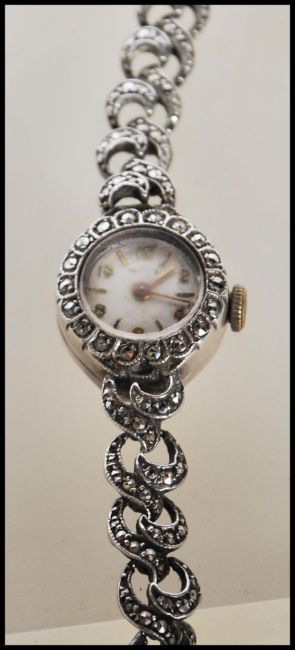 A vintage 1960's Hermes watch having a silver hallmarked case and strap set with marcasites, the silvered dial having quarterly Arabic numerals and baton markings between. Hallmarked Birmingham 1961. Total weight 18.8g.