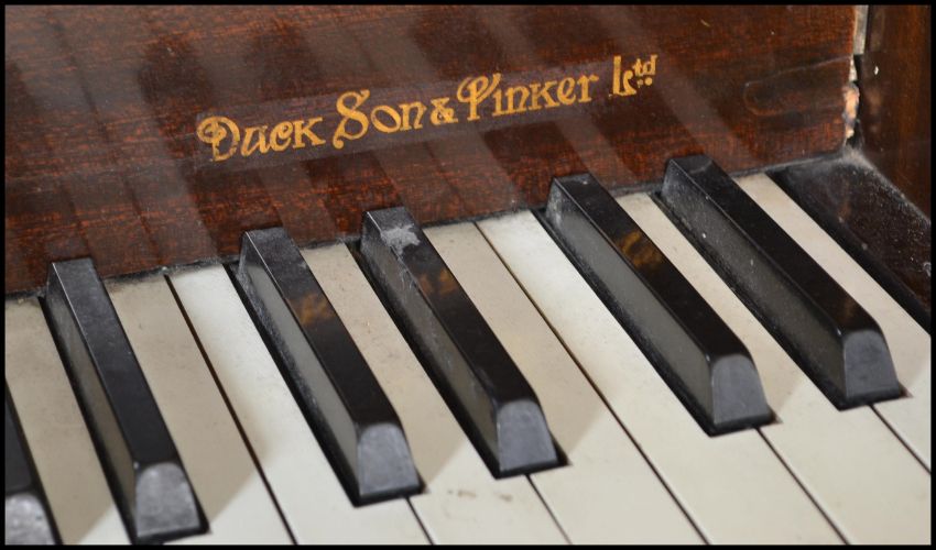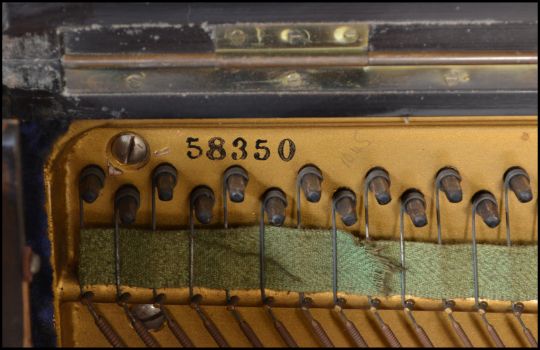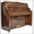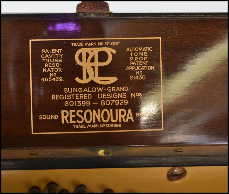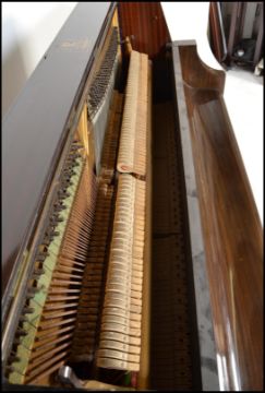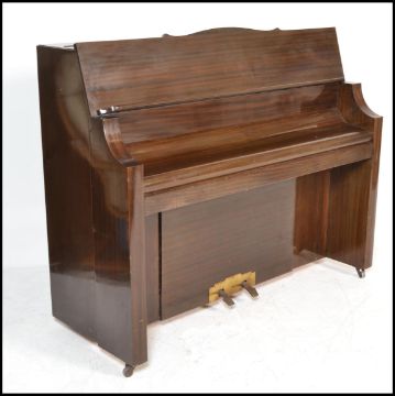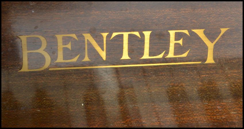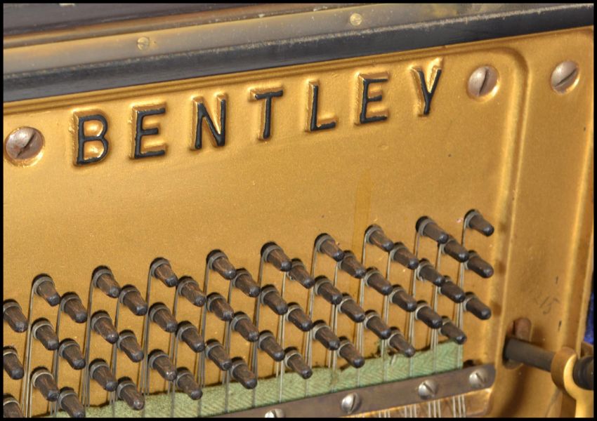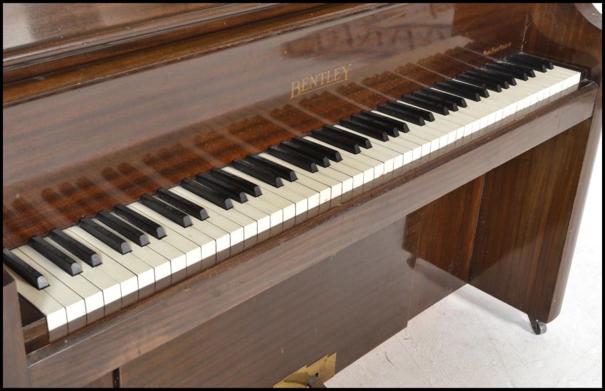 An early 20th Century Art Deco 1930's walnut Bungalow piano by Bentley. Iron frame overstrung with Resonoura soundboard in figured walnut case. Measures 111cms high x 135cms wide x 53cms depth
