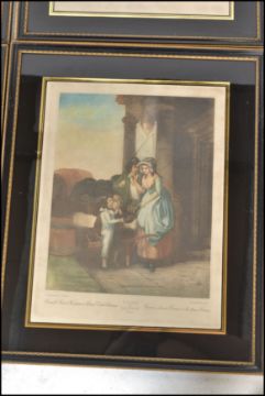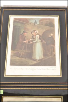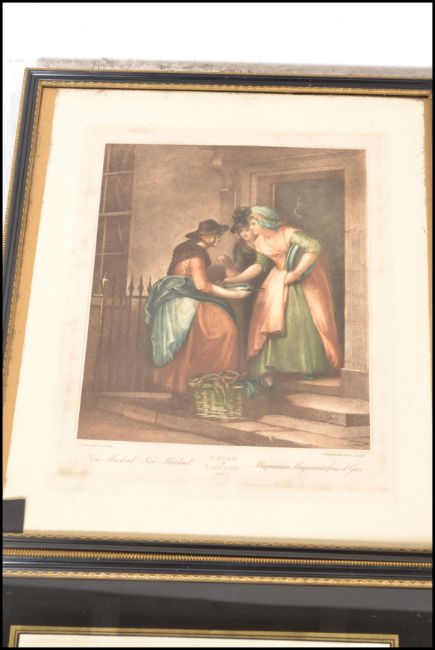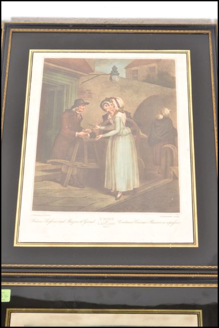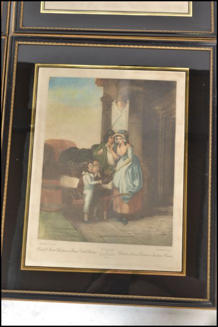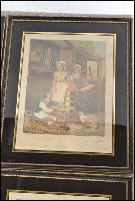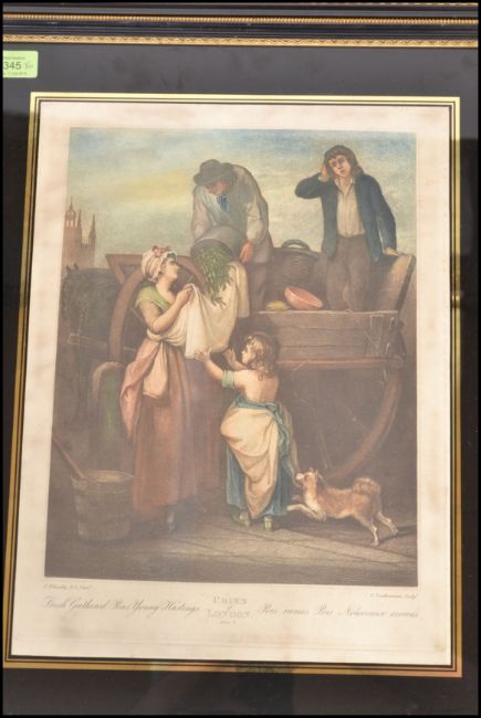 A group of six 19th 'Century Cries' of London hand coloured engravings after F. Wheatley R. A. to include 'Strawberrys, Scarlet Strawberrys', 'New Mackrel, New Mackrel', 'Fresh Gathered Peas, Young Hastings', 'Round & Sound Fivepence a Pound Duke Cherries', 'Old Chairs to Mend' and 'Knives, Scissors and Razors to Grind'. Framed. Measures 54cm high x 44cm wide.