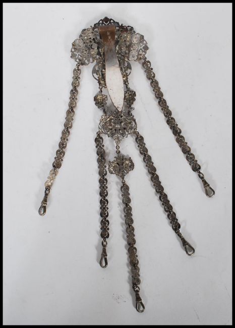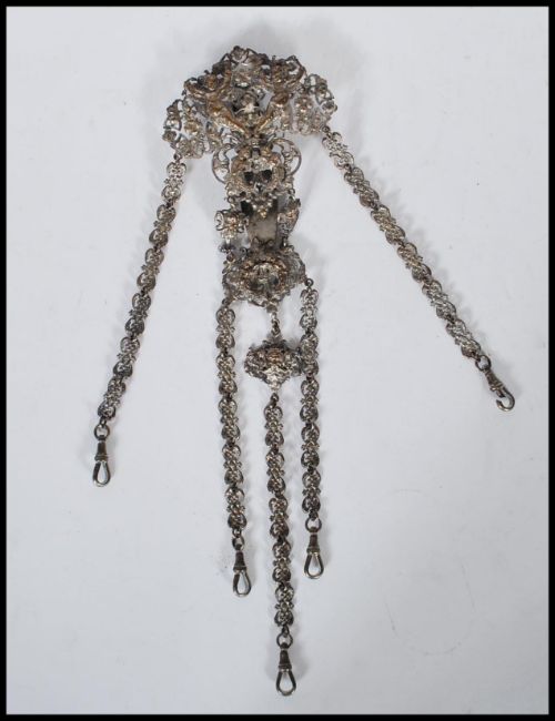 A Victorian silver white metal chatelaine having central panel decorated with cherubs and pierced floral and scroll decoration, with 5 linked chains having mask and foliate decoration and clasp to each end. Belt hook to verso. Weight 98g.