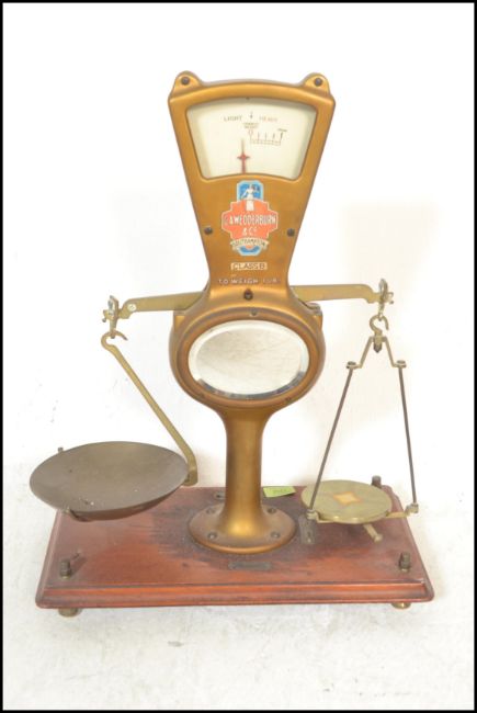 A set of vintage 20th Century shop grocery balance scales, gilt body with glazed dial to the top, mirror panel with notation for makers Wedderburn of Southampton, raised on a mahogany base. 58cms x 44cms