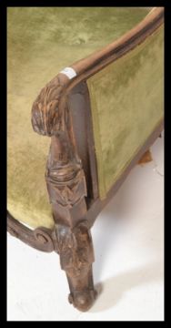 A 19th Century Victorian mahogany two seater sofa settee raised on scrolled legs with carved shaped arm rests. Original green upholstery present. Measures 88cm high x 142cm wide x 80cm depth.