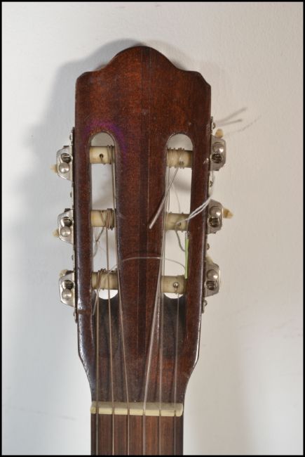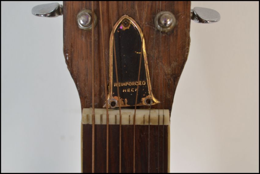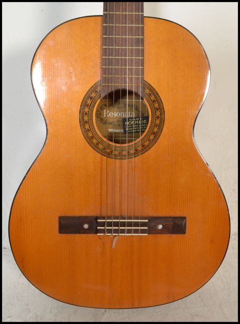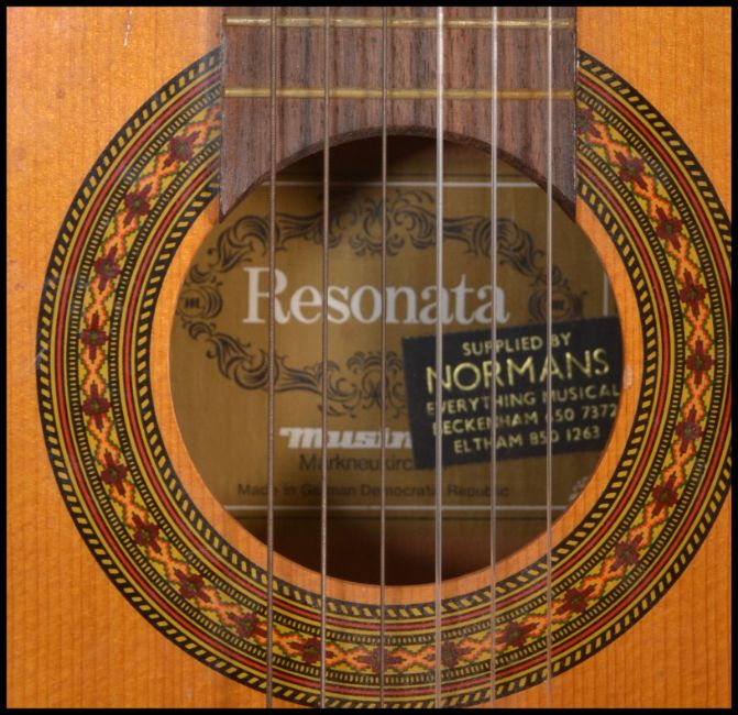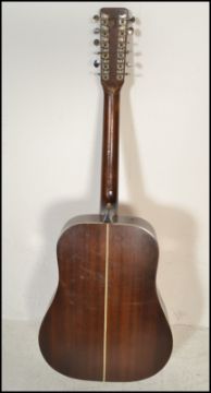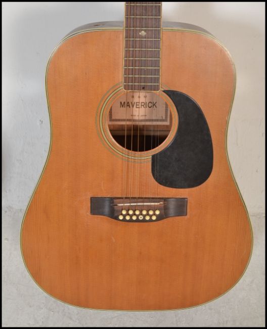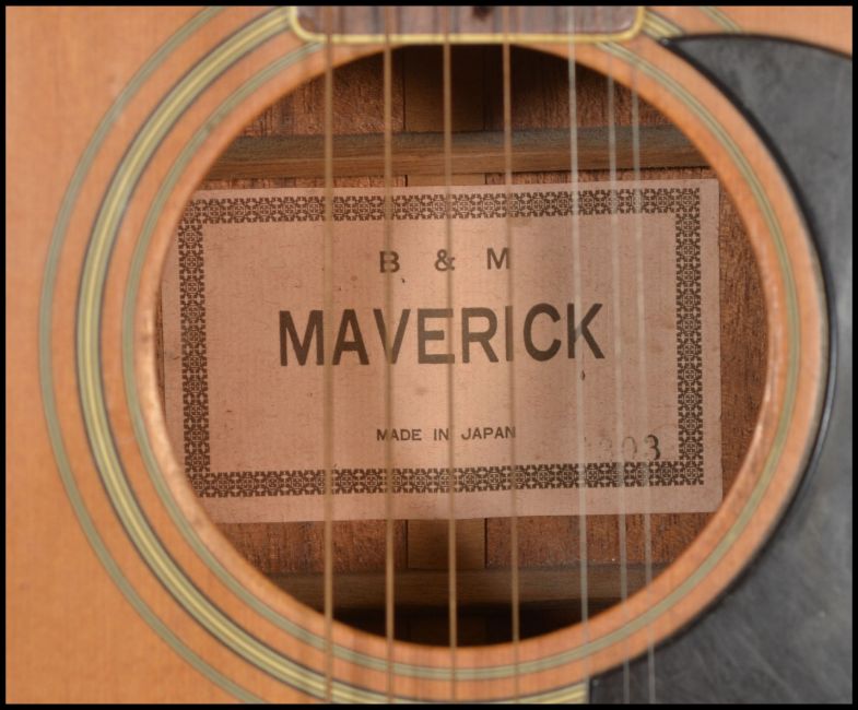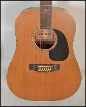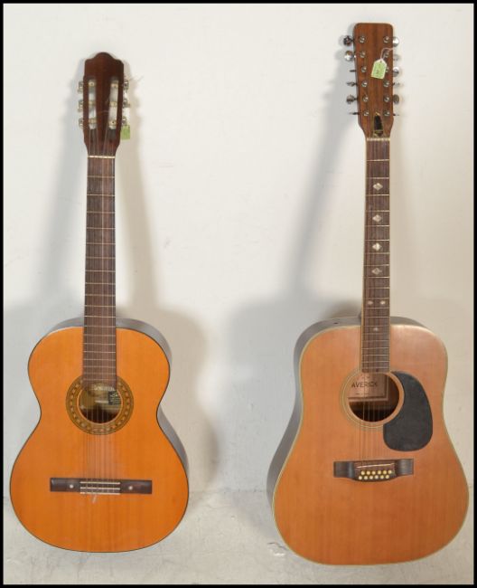 A twelve string acoustic guitar by B & M Maverick of typical form having chrome tuning pegs and mother of pearl fret markers. Together with another six string acoustic German guitar by Resonata. Both having paper labels to inner.