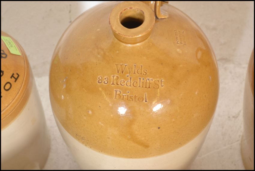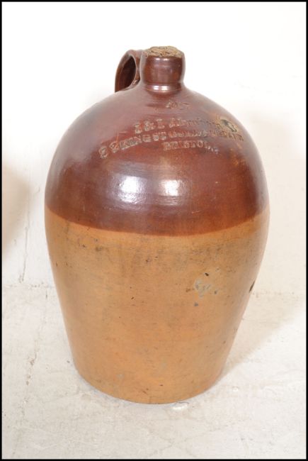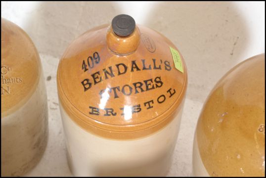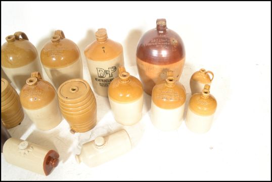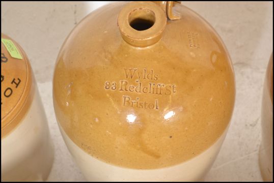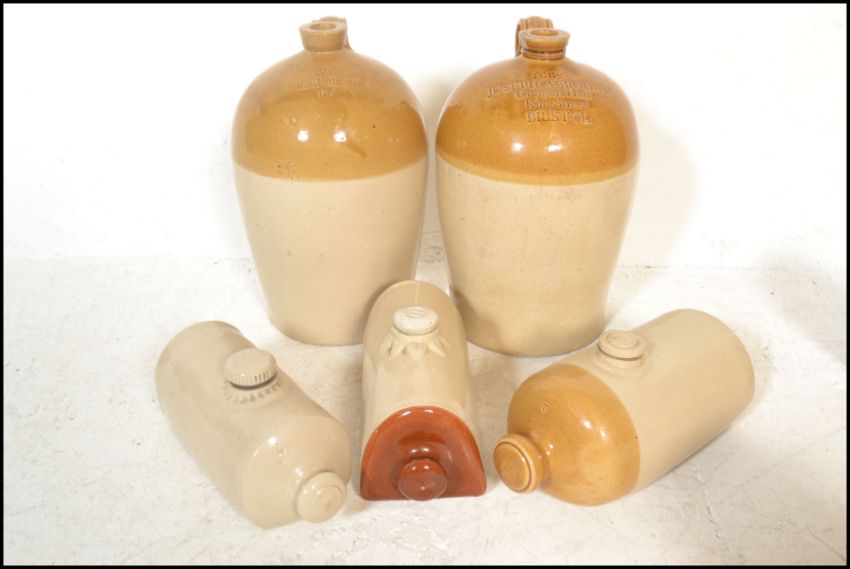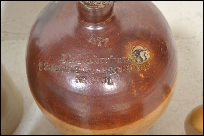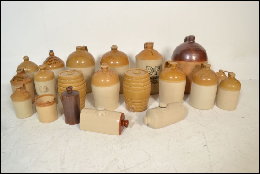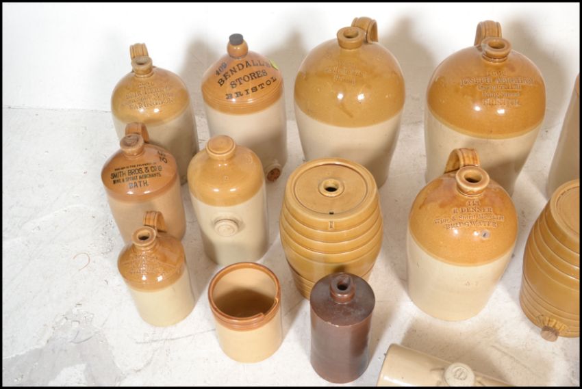 An extensive local collection of 19th century and early 20th century stoneware / saltglaze flagons being of South West interest. Many shapes and sizes to include examples by Josepth Abraham of Coopers Hall, King St, Bristol, Wylds of 83 Redcliff St, Bristol, Deanesly of Wincanton, Smith Bros of Bath, W Ottway of Southampton, Ferris & Co of Bristol, Price of Bristol barrels, R Denner of Bridgwater, Stallard of Worcester Distillery Bristol Branch, Brooke Prudenco of Newfoundland St Bristol, I&I Abraham Bristol, Belcher & Co of Faringdon, Chanley of Bristol, Bendalls Stores of Bristol, tobacco jar with scene of Clifton Suspension Bridge ( differing lid)  along with others etc. Largest measures 50cms high