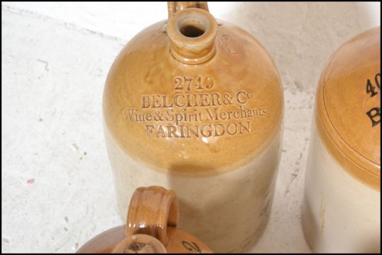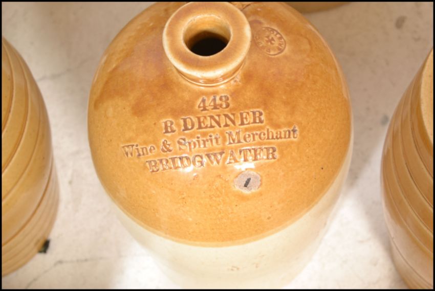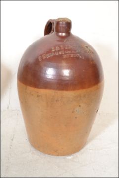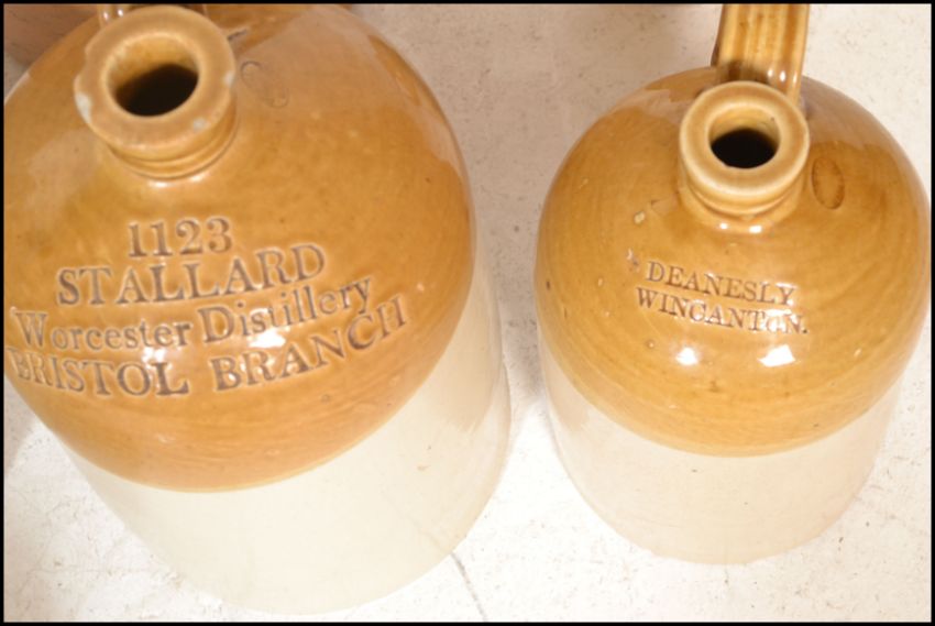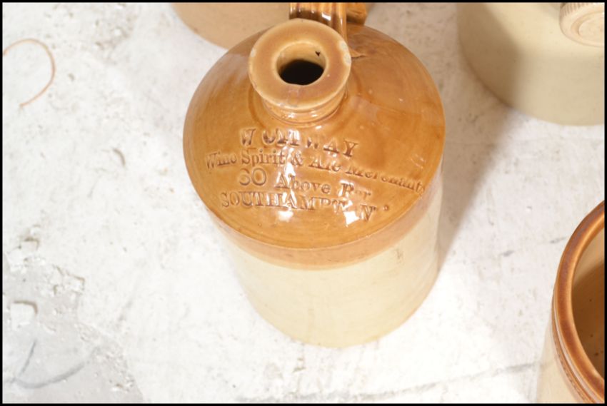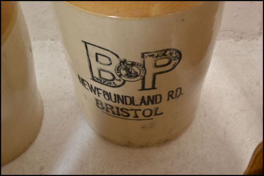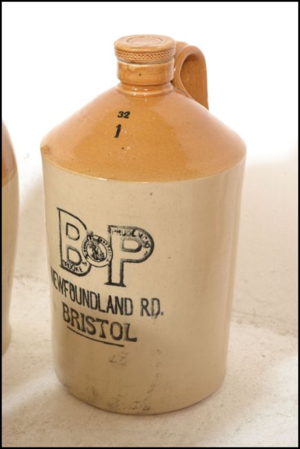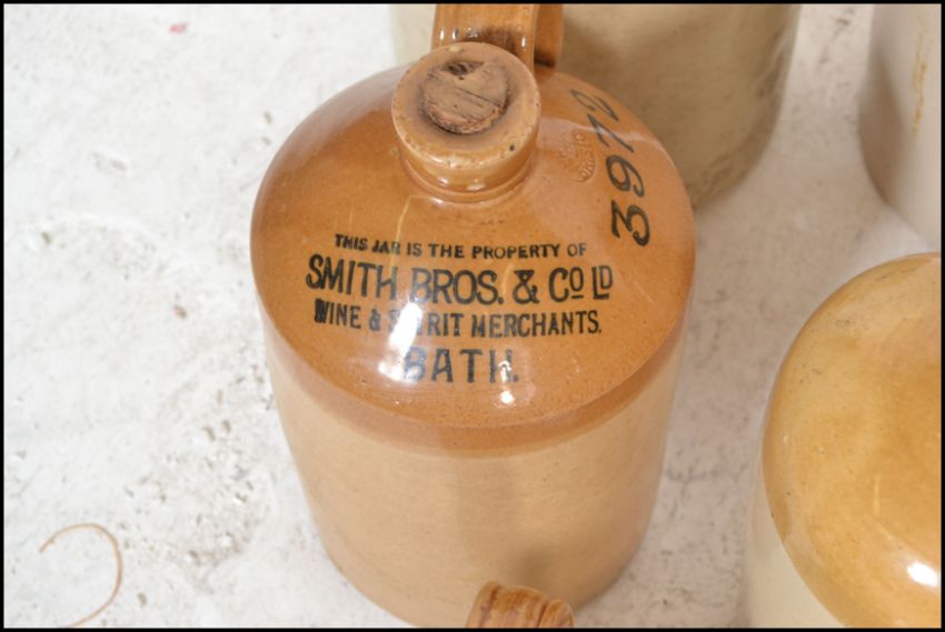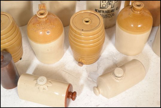 An extensive local collection of 19th century and early 20th century stoneware / saltglaze flagons being of South West interest. Many shapes and sizes to include examples by Josepth Abraham of Coopers Hall, King St, Bristol, Wylds of 83 Redcliff St, Bristol, Deanesly of Wincanton, Smith Bros of Bath, W Ottway of Southampton, Ferris & Co of Bristol, Price of Bristol barrels, R Denner of Bridgwater, Stallard of Worcester Distillery Bristol Branch, Brooke Prudenco of Newfoundland St Bristol, I&I Abraham Bristol, Belcher & Co of Faringdon, Chanley of Bristol, Bendalls Stores of Bristol, tobacco jar with scene of Clifton Suspension Bridge ( differing lid)  along with others etc. Largest measures 50cms high