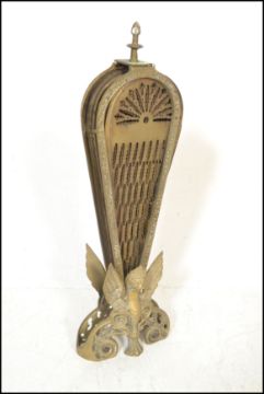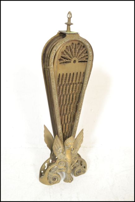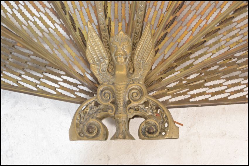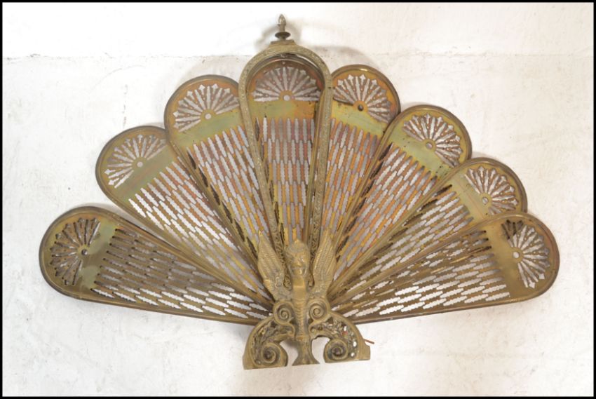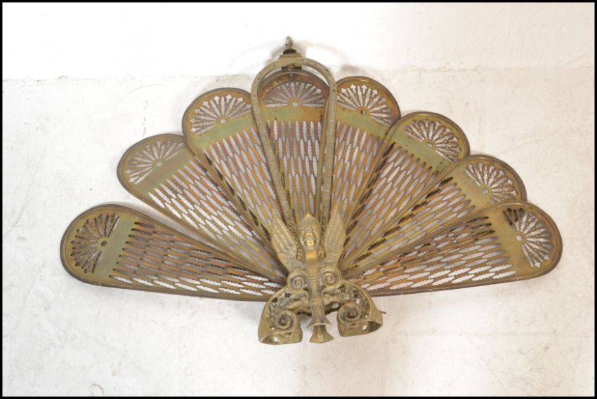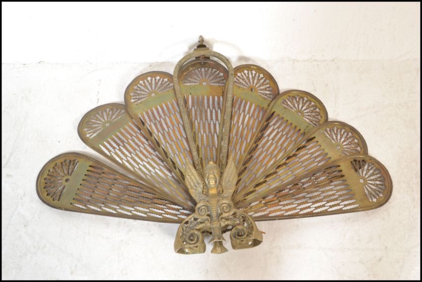 An early 20th century peacock fan fireguard having fold out brass fan sections with pierced decoration and finial top. 65cms high