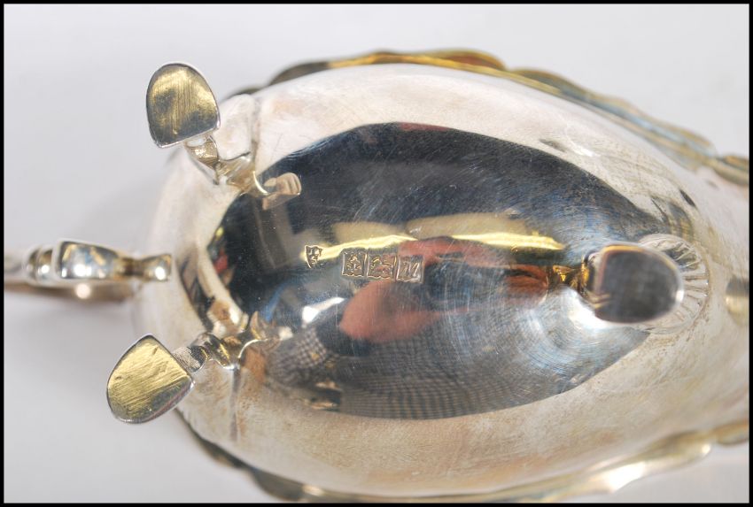 A silver hallmarked sauce boat being raised on cab feet with a shaped scrolled handle with an acanthus leaf to the top (hallmarked Birmingham 1961), along with a silver hallmarked tea scoop with floral engraving (hallmarked Birmingham 1894) and a silver hallmarked caddy spoon (hallmarked Birmingham 1961). Total weight 83.5g.
