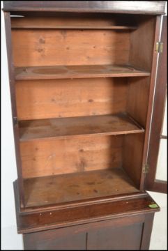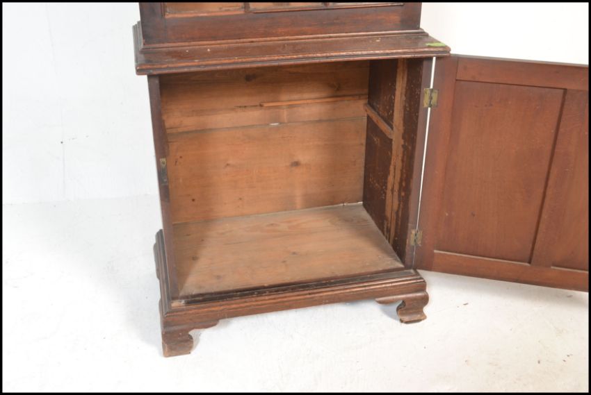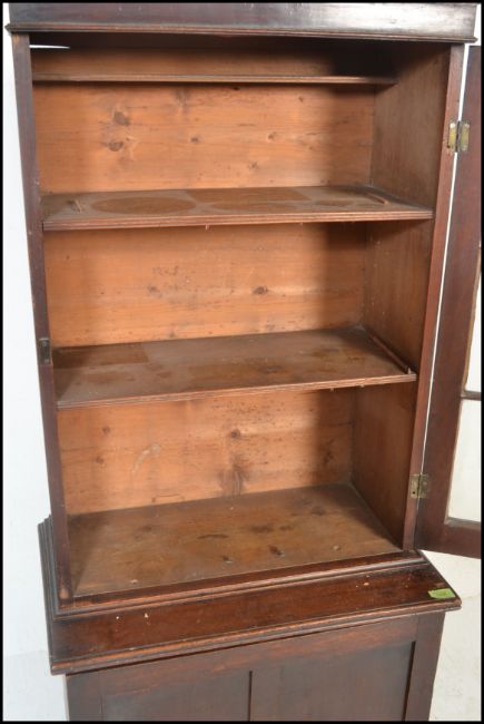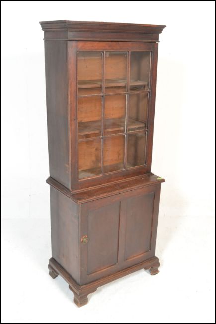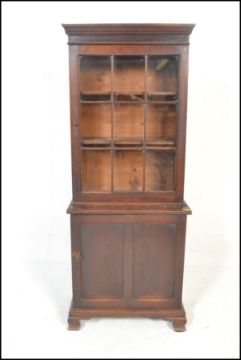 A 19th century Victorian library bookcase cabinet. Raised on shaped bracket feet with locker door cupboard. Above an upright bookcase with full length astragal glazed door housing shelves set within. Measures 185cm high x 95cm wide x 35cm depth.