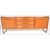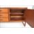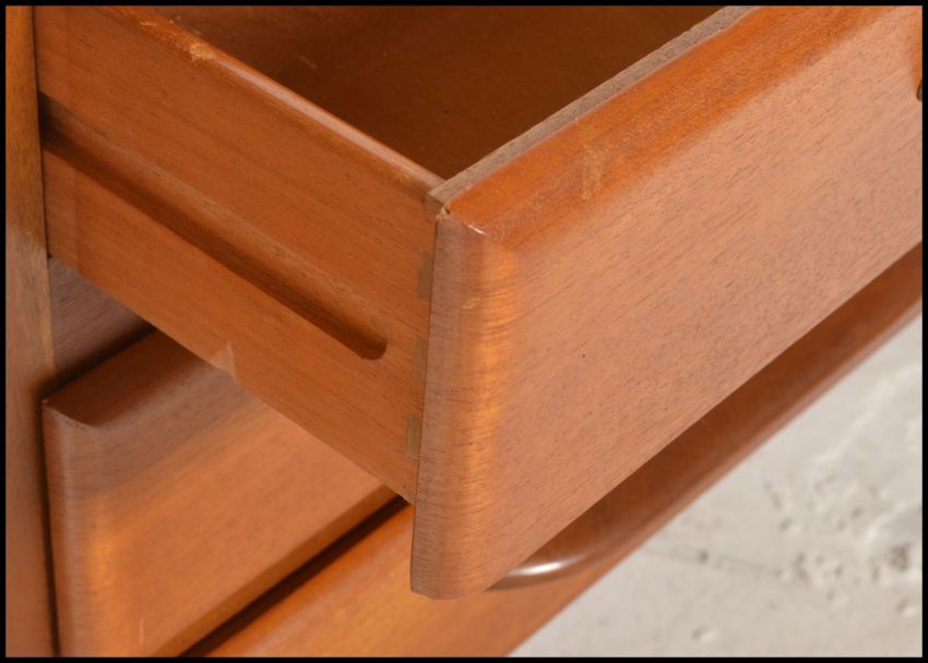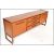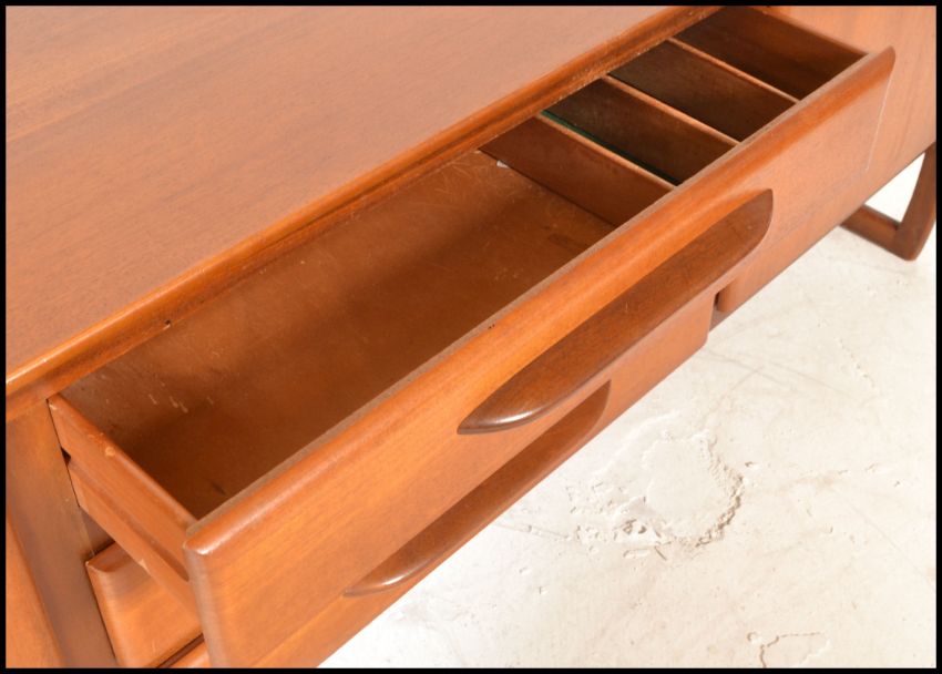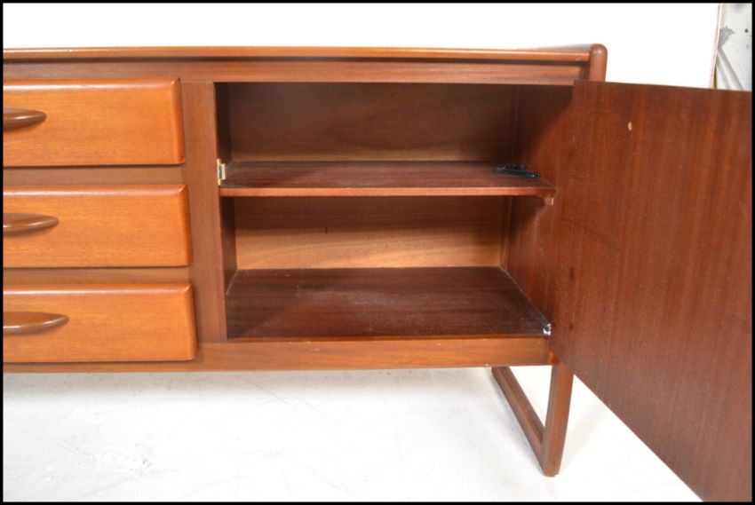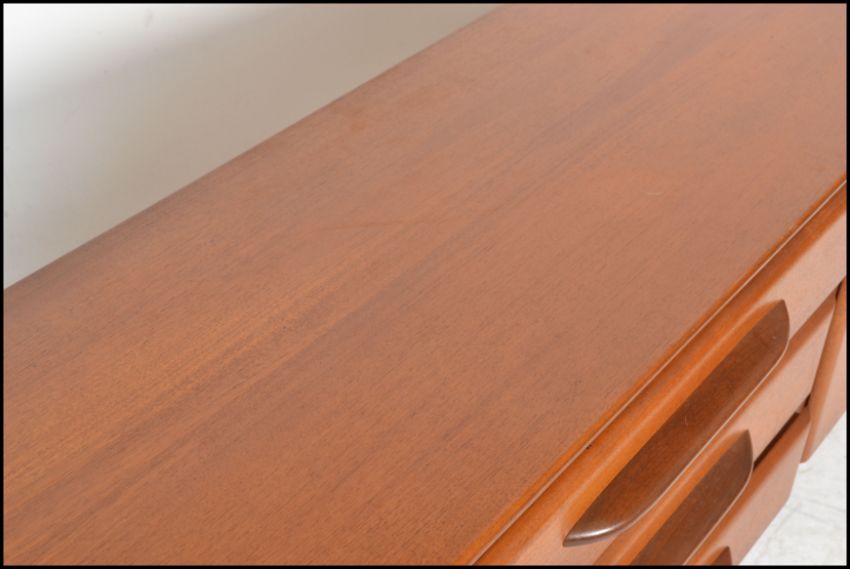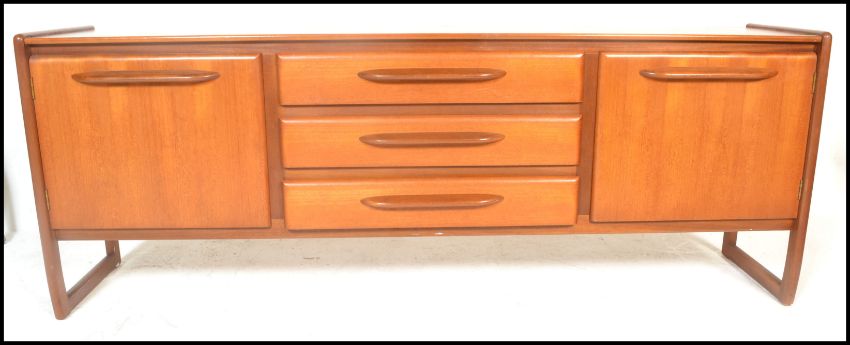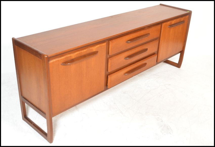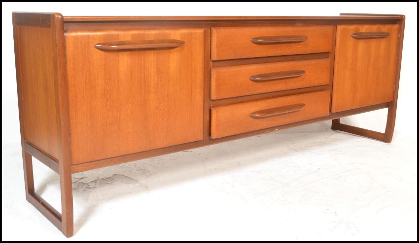 A retro 20th Century G Plan style teak wood sideboard / credenza, flared top over a central bank of three drawers flanked by cupboards raised on shaped quadrille style supports. Measures 72H x 199W x 44D.