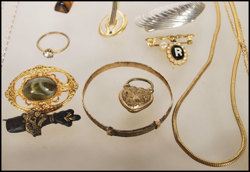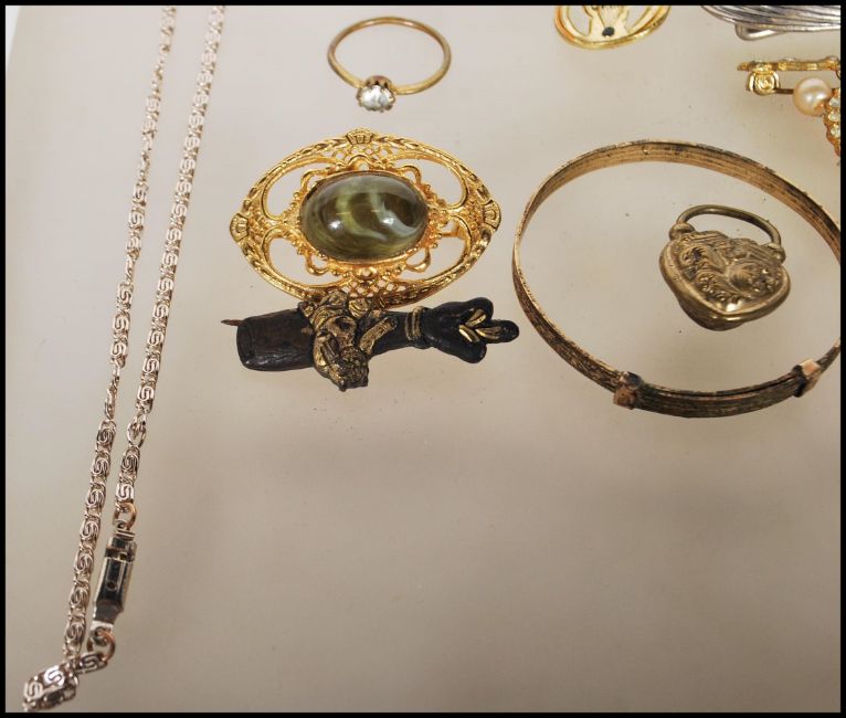 A quantity of vintage and later costume jewellery to include a silver ingot on chain, marcasite brooch, interesting black wooden bead belt, Czech bohemian brooches and watches.