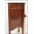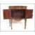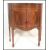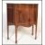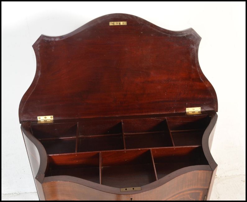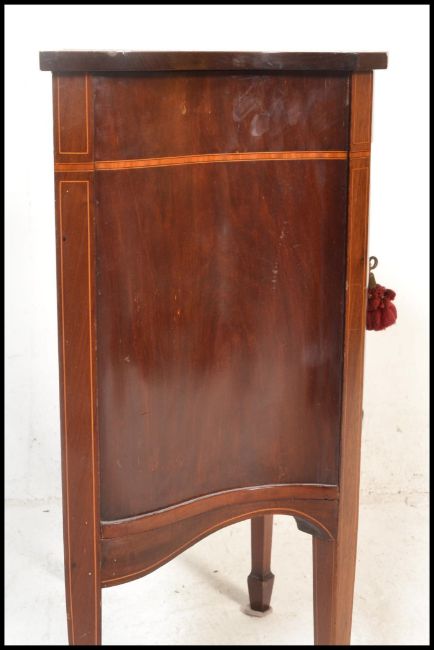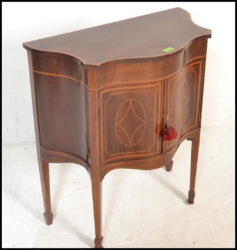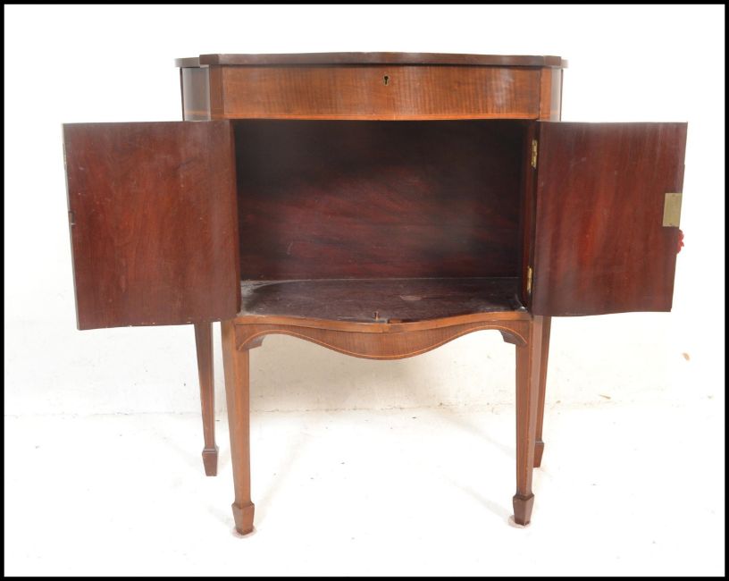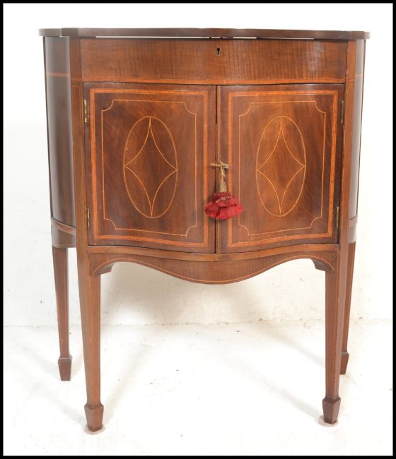An Edwardian mahogany inlaid serpentine fronted side cabinet / work table. The hinged top with appointed interior set over 2 inlaid doors to the shelved cupboard. All raised on square tapering legs with spade feet.