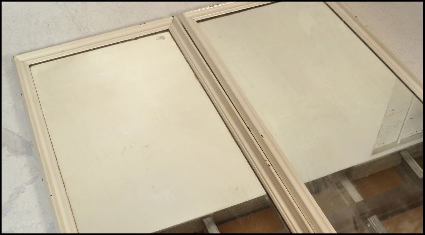 A pair  vintage early 20th century shop / haberdashery mirrors. Of rectangular form having white painted wooden cushion surround with central plate mirror glass. Belonged to the vendors family who once owned a shop in Bristol. 152cms x 63cms.