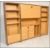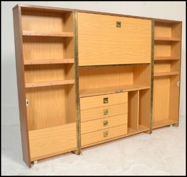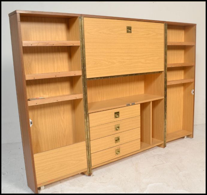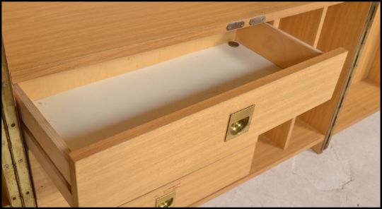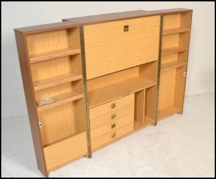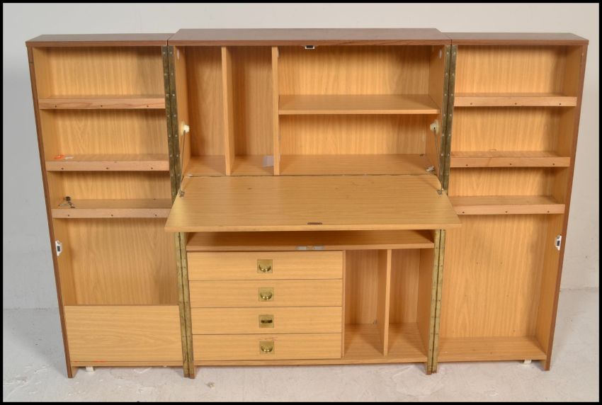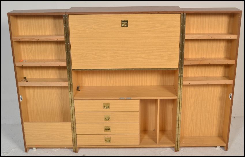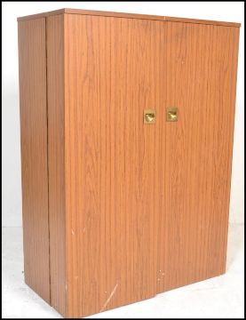 A 1970’s retro cube desk cabinet. Faux teak wood veneers with brass campaign  handles opening to reveal a fully appointed bureau and cubby interior. Measures 110cm x 80cm x 42cm.