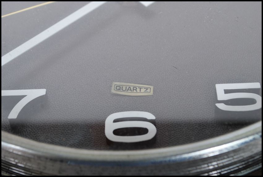 A retro 20th Century industrial / factory / school wall clock by Metamec, brown body with white face having an Arabic numeral chapter ring with fitted quartz movement together with Metamec vintage Zodiac wall clock.