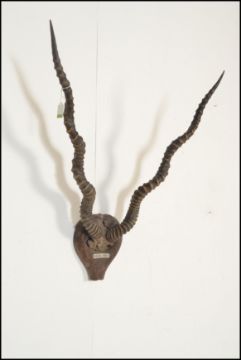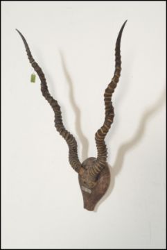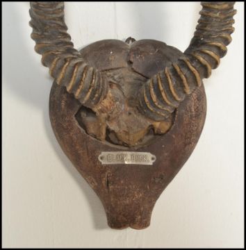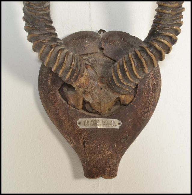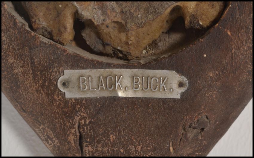 Taxidermy Interest. A pair of early 20th Century wall mounted Black Buck horns, set to a small wooden panel having metal stamped plaque 'Black Buck'. Horns measure 61 cm each.  Taxidermy interest.