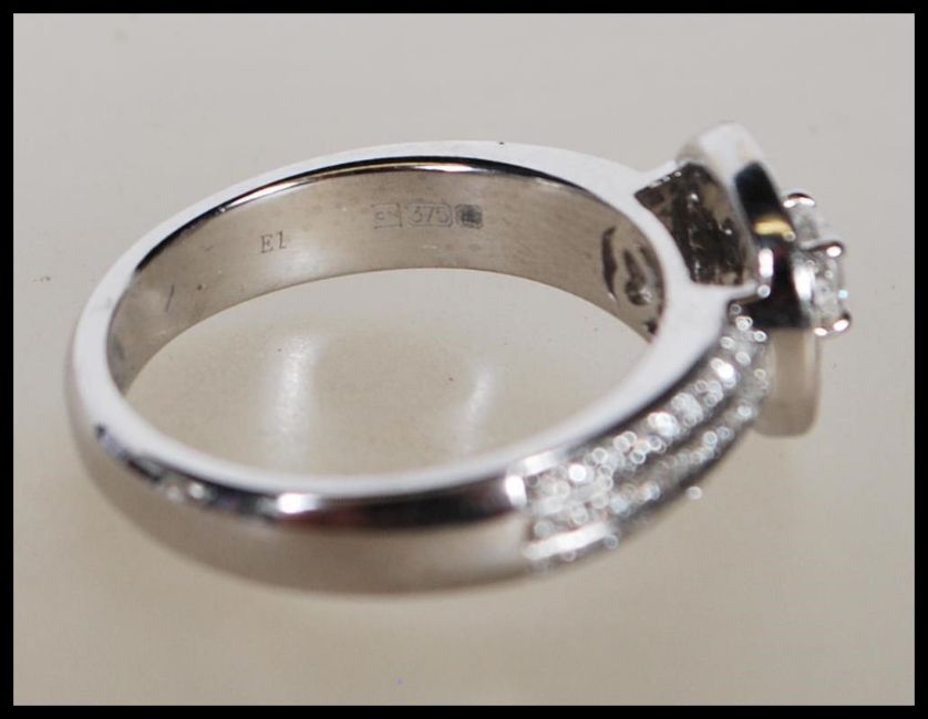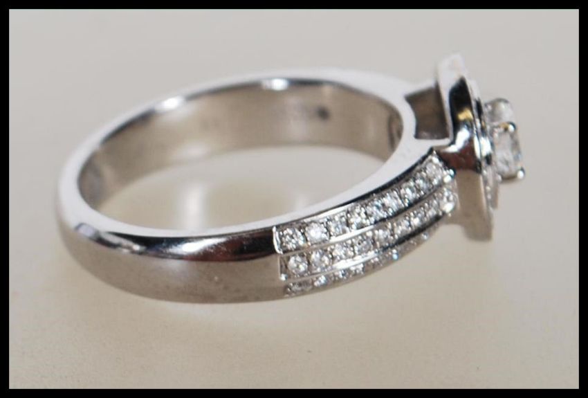 A hallmarked 9ct white gold and diamond cluster ring. The ring having concentric diamond set halos with a central brilliant cut diamond of approx 0.25cts. Size K.5  / Weight 4.48g