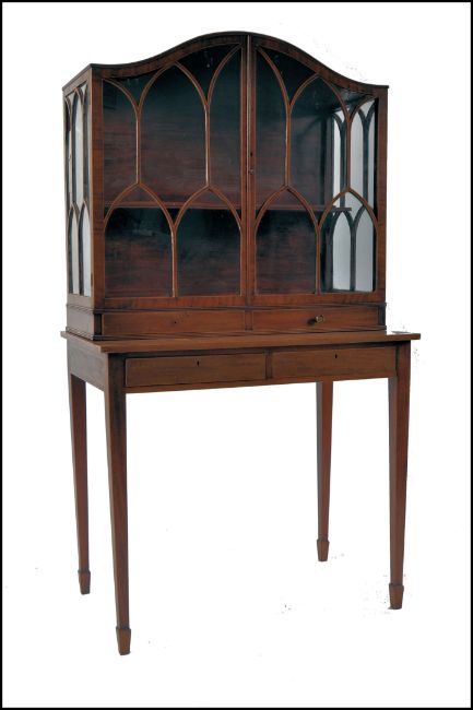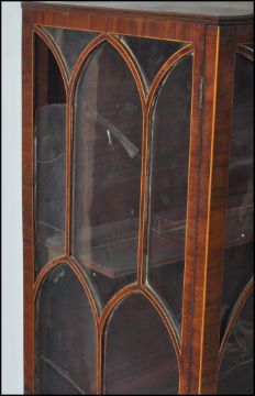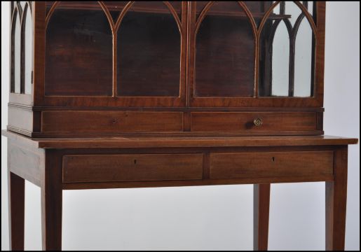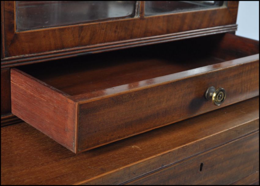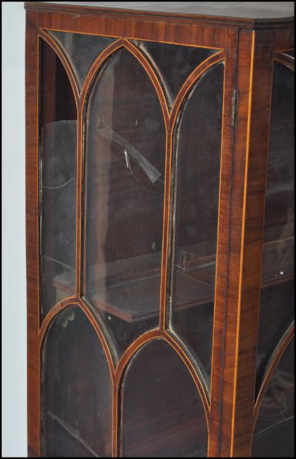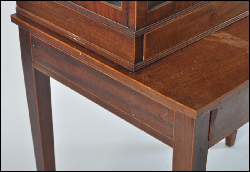 A 19th century George III, circa 1800 - 1810 mahogany inlaid dome top display cabinet on stand. Raised on square tapering legs with spade feet having double drawers to the stand / table top. Above a dome dop display cabinet with twin astragal glazed doors housing shelves within. Measures 157cms high x 88cms wide x 51cms depth