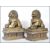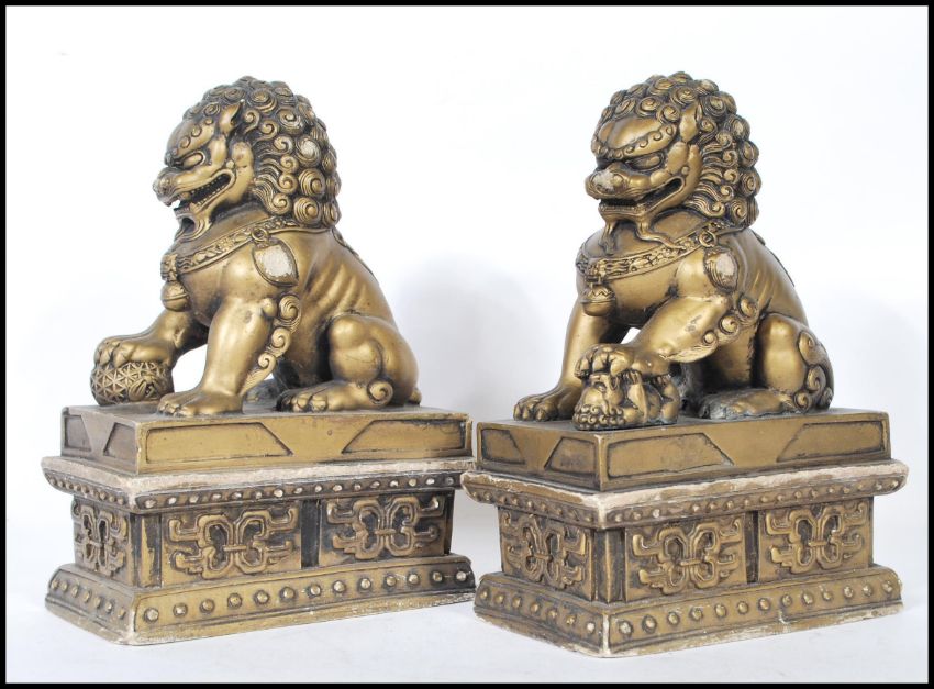 A pair of gilt temple dogs / foo dogs, both posed upon pedestal bases with their paws upon a ball & a smaller lion dog. Measures: 21cm tall.
