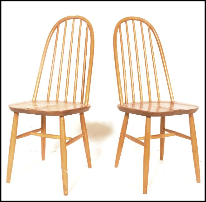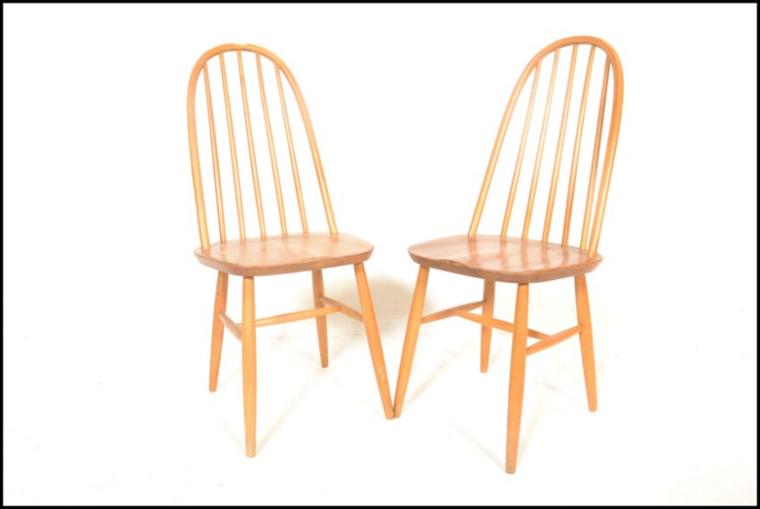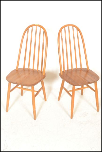 A pair of 20th Century Ercol Windsor style Priory Quaker hoop-back dining chairs in light elm, raised on tapering legs. Measures 98cms x 38cms x 55cms.