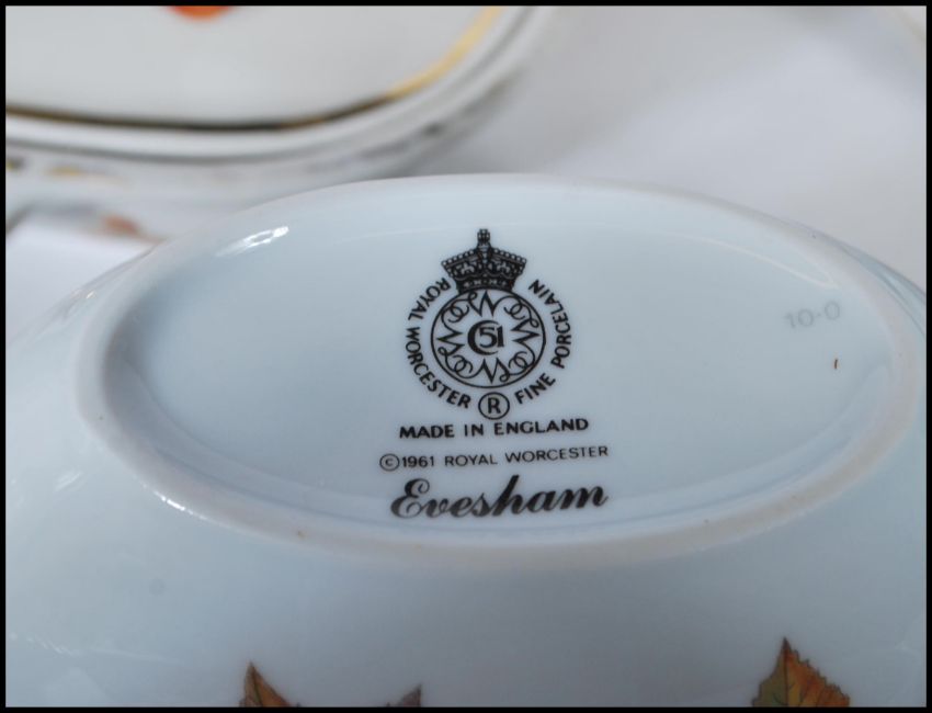 A good collection of Royal Worcester ' Evesham ' pattern ceramics to include teapot, tureens, gravy boat, serving dishes, serving pots and other wares all being stamped to the under side