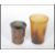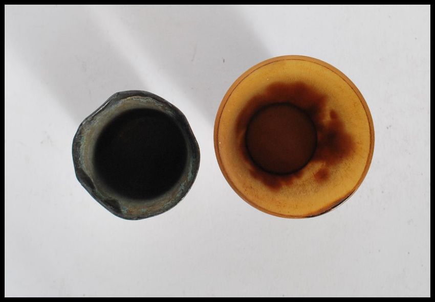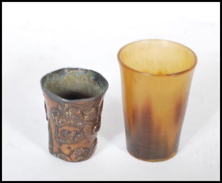 A Chinese cast bronze cup of small proportions having raised Chinese dragon decoration having a lead lined interior, together with another cup made from horn.