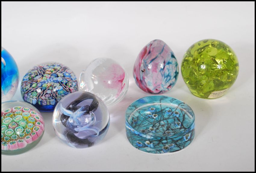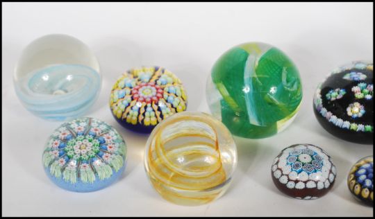 A good collection of retro vintage 20th Century studio art glass paperweights including Caithness, Strathern, Dartington, Millefiori, Shatterline lucite etc. Some with original labels.
