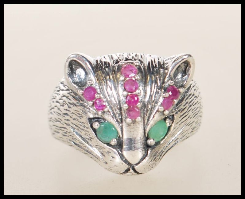 A silver ring in the form of a cats head with emerald eyes and channel set ruby's to the head. Size P / Weight 6.97g