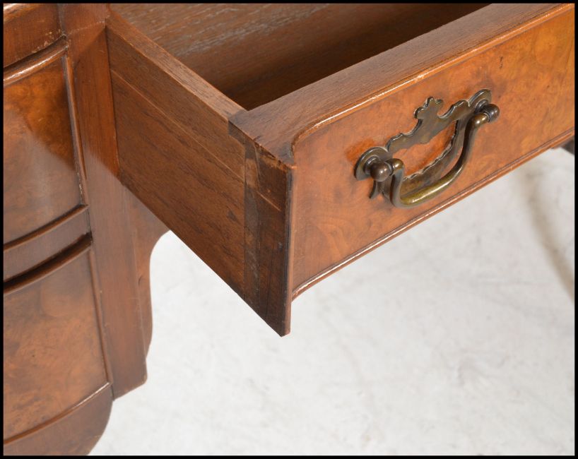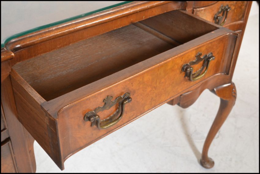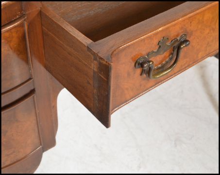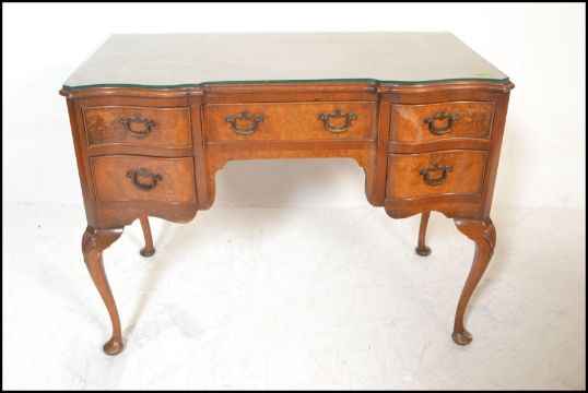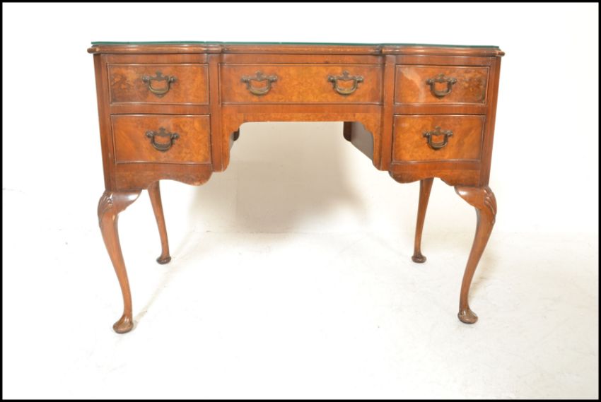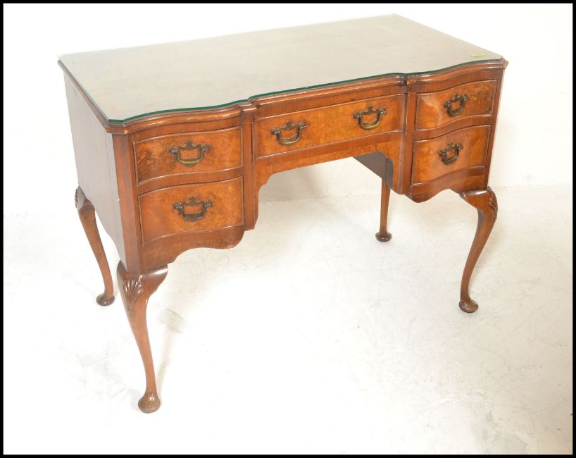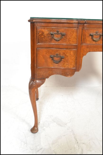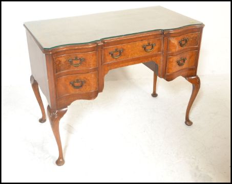 A good Queen Anne revival walnut serpentine fronted writing table desk. Raised on cabriole legs with pad feet. The widebody with a bank of serpentine fronted drawers with brass handles having central kneehole recess and crossbanded desk top above. Measures 82cm high x 105cm wide x 55cm depth.Kneehole measures 60cms H x 40cms W.