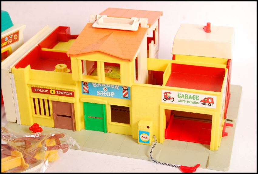 A collection of original vintage Fisher Price made Little People playsets figures and accessories to include Play Family Camper, Town set along with a Matchbox Live n Learn Play Boot. Good quantity of figures present.