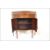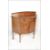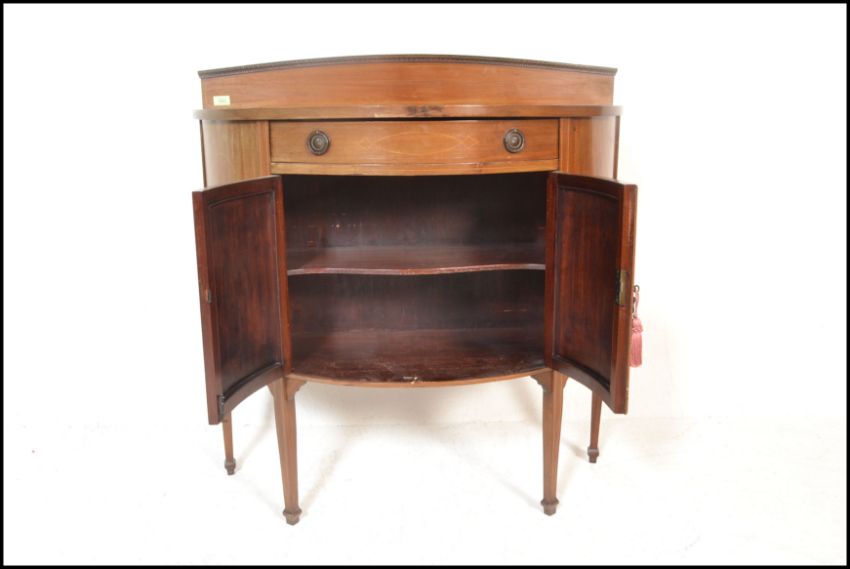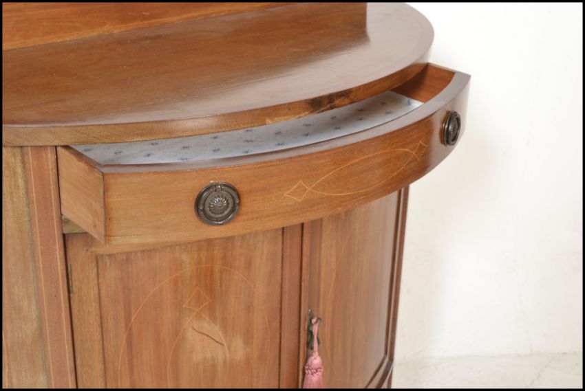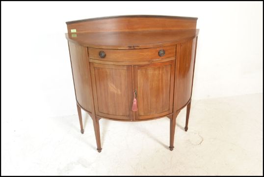 An Edwardian mahogany and satin wood inlaid  demi lune sideboard cabinet. Geometric fashion line inlays , with one drawer above a pair of panelled cupboard doors enclosing shelves and raised on square tapering supports with spade feet. Measures 106cm high x 103cm wide x 42cm depth.
