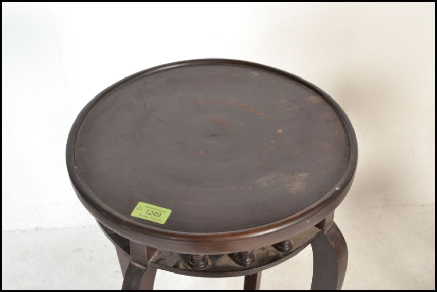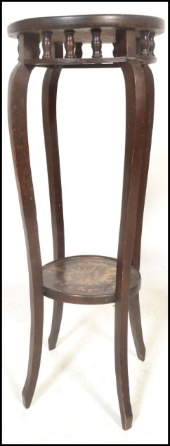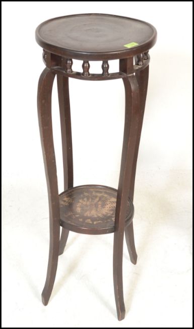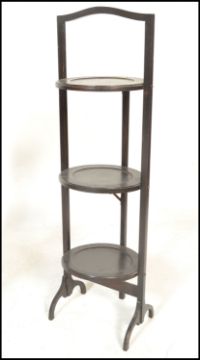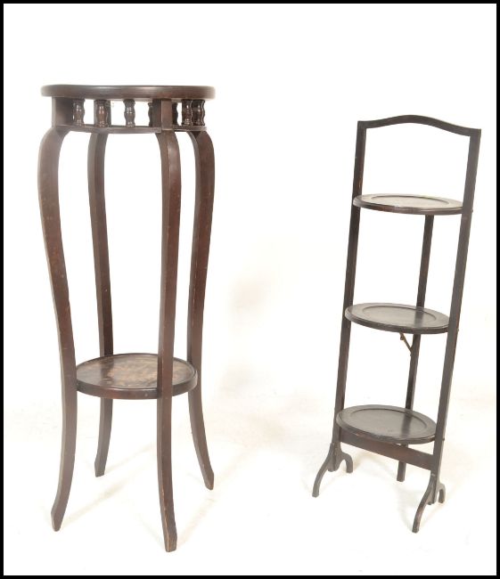 An early 20th Century mahogany 3 tier metamorphic cake stand having shaped tiers complete with the handle atop. Together with a 2 tier Torchere / plant stand having under tier gallery decoration raised on four legs. 93cms x 35cms diameter.