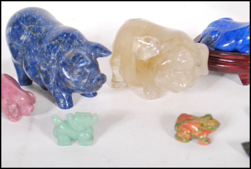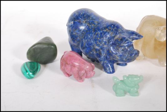 A group of 20th Century carved precious stones and carved stone animals including a lapis lazuli frog and pig, a blue john specimen, malachite specimen, a labradorite specimen, Libyan desert glass, a carved jade Chinese dragon, a carved stone in the form of a lizard etc.