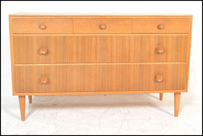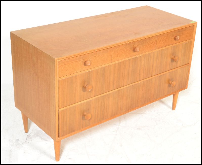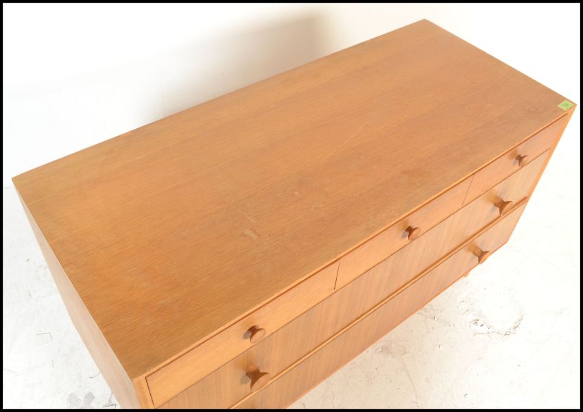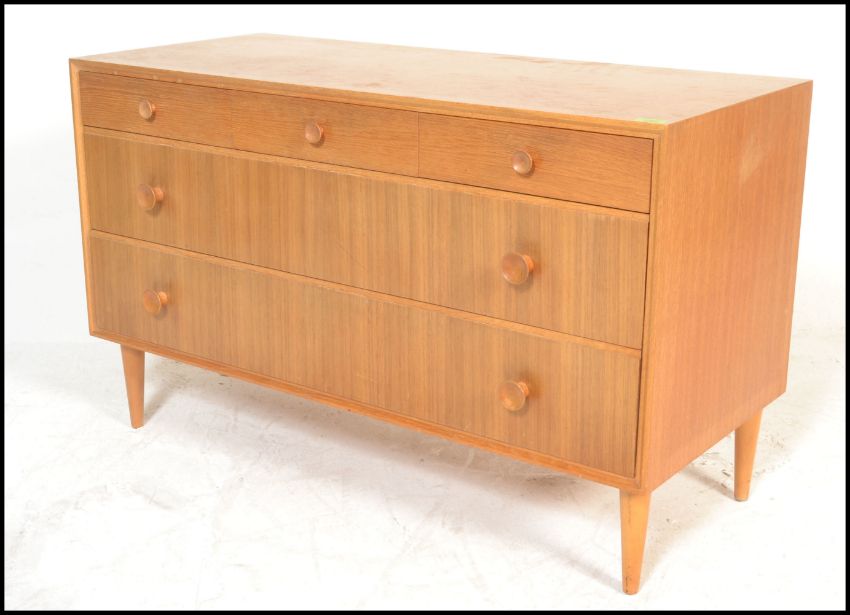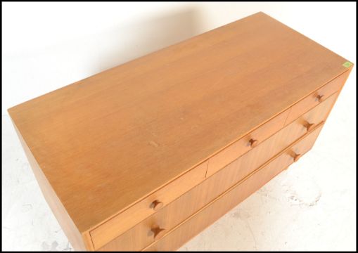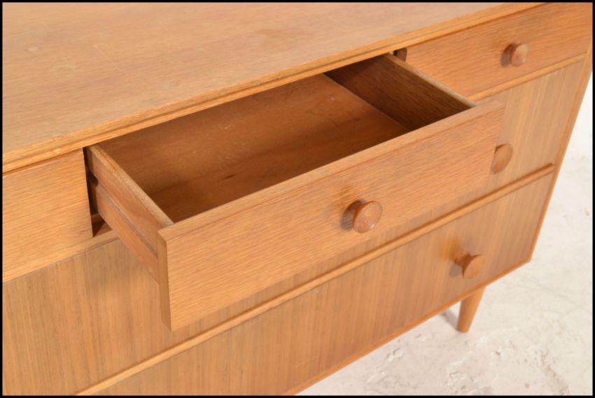 A retro 20th Century teak wood Danish inspired sideboard / credenza, having a configuration of three short drawers over two long drawers raised on tapering turned supports. Measures 67H x 107W x 45D.