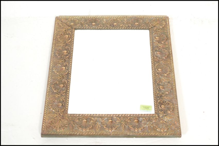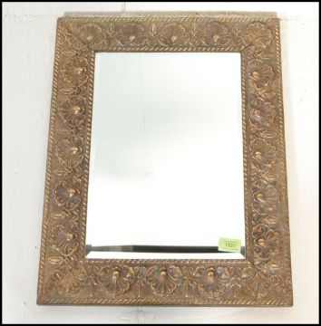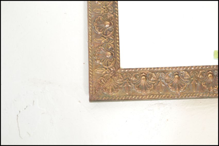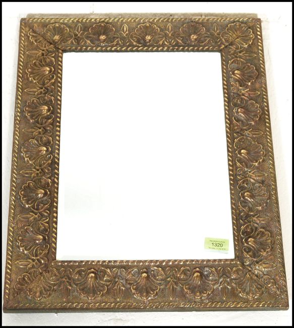 An early 20th Century wall mirror of rectangular form having an embossed brass frame with scallop shell design together with a brass table lamp raised on a stepped walnut base  having two brass sconces with central loop handle. 50cms x 33cms
