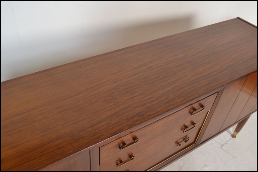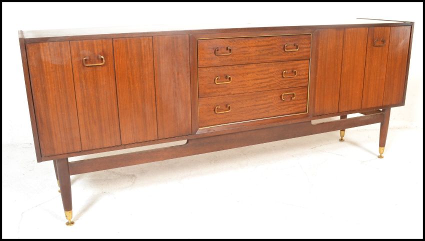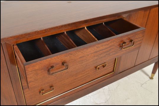 A mid 20th Century teak wood sideboard / credenza, by Ernst Gomme for G-Plan central bank of three drawers flanked by bi-fold doors, drop swap brass handles raised on turned tapering supports united by stretchers. Measures 76H x 91W x 43D.