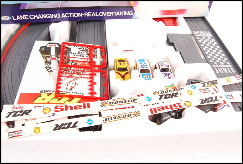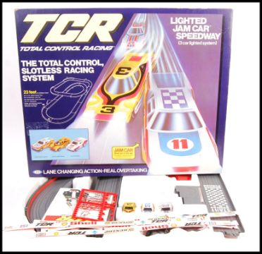 An original vintage Ideal TC Total Control Racing slot car set Lighted Jam Car Speedway 3 Car Lighted System with Pantera Jam Car, Pantera and Lancia Stratos. Contents appear complete however unchecked. Box very good.