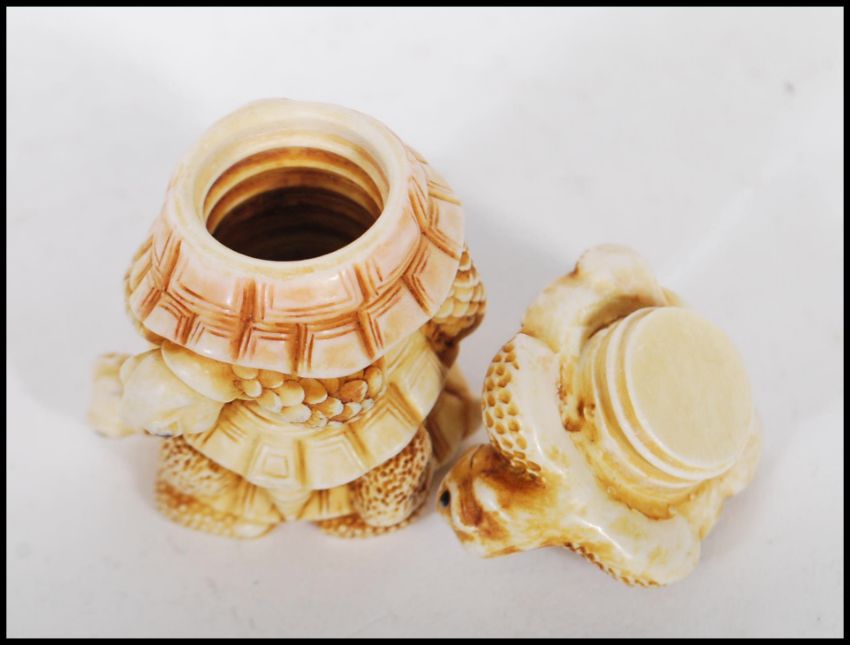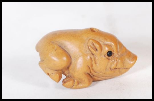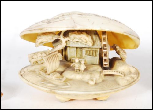 A collection of 20th Century Asian ornaments to include a Harmony Kingdom netsuke style box with a twist lid along with an SIAB trinket box in the form of a school of fish, a cast resin dream shell and a carved wood netskue in the form of a pig with black glass eyes.