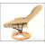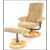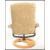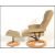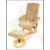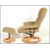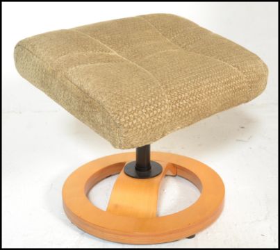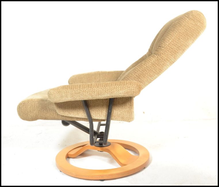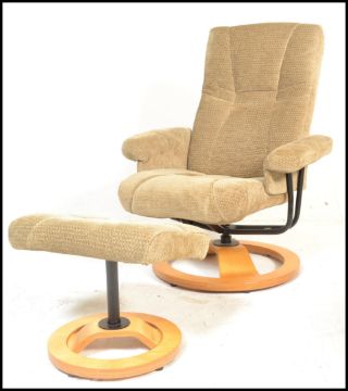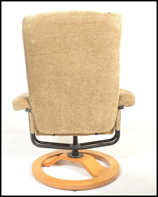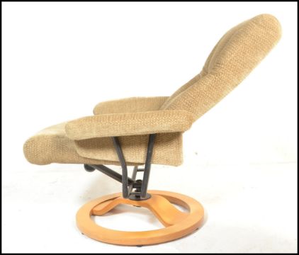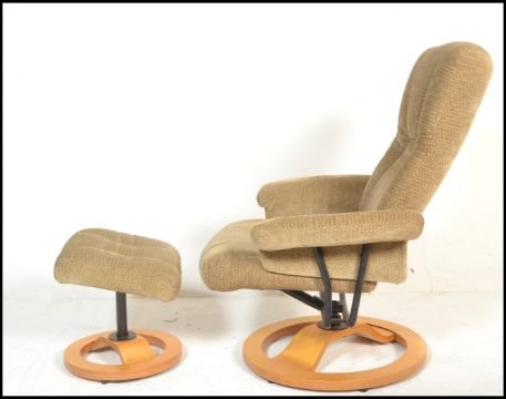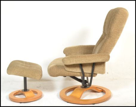A contemporary ' modernist ' 21st century reclining and swivel armchair in the manner of Ekornes of Sweden. Raised on circular wooden base with ottoman, all with original upholstery. Measures 105cm x 76cm x 70cm.