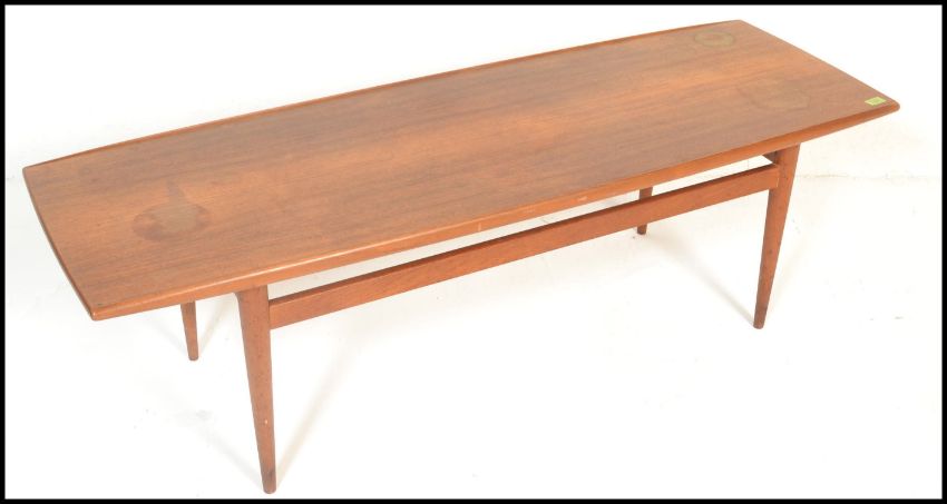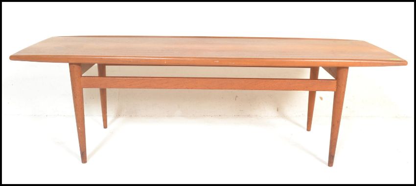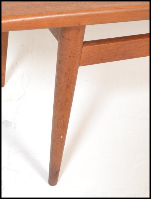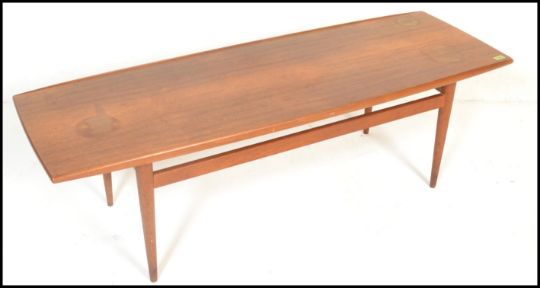 A mid century believed Danish long john coffee / occasional table. Of rectangular form with shaped edges to the top raised on turned, tapering supports with undertier. Measures 45H x 150W x 51D.