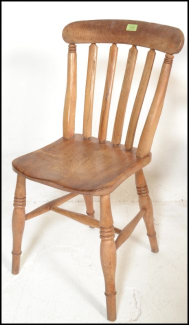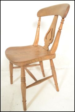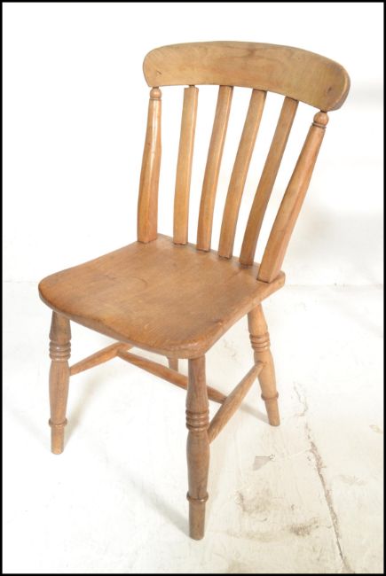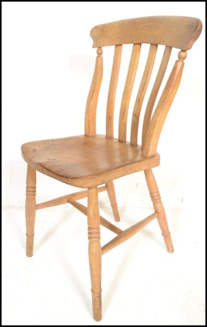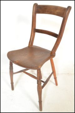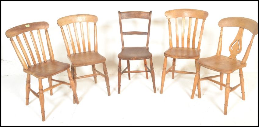 A harlequin set of 5 Victorian 19th century beech and elm dining chairs. To include Windsor style lathe backs, Oxford bar backs, all with beech and elm construction