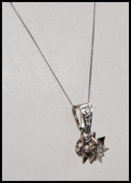 An 18ct white gold diamond necklace pendant in the form of  a starset with a diamond adorned bale set on a fine back chain complete in the presentation box. Chain measures 44cms. Pendant & bale 2cms