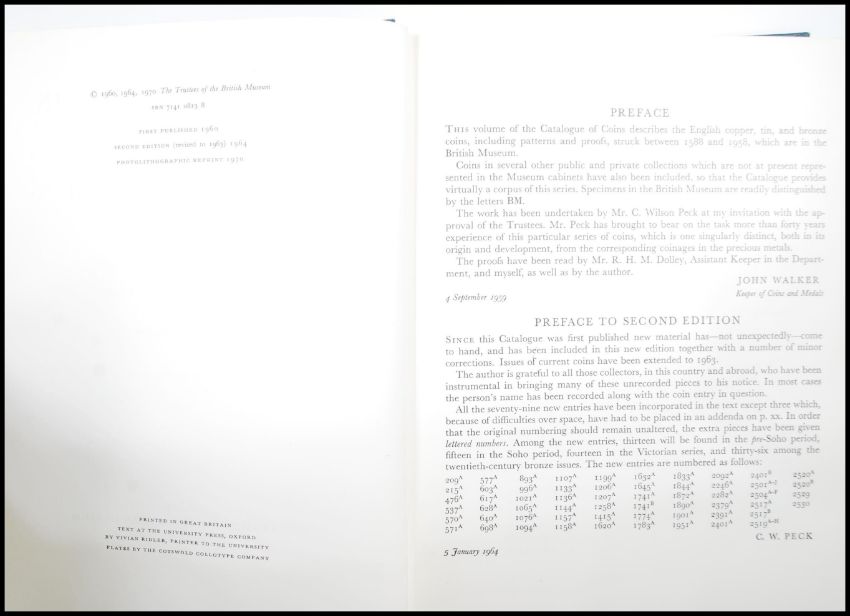 English Copper, Tin And Bronze Coins In The British Museum 1558-1958 by C. Wilson Peck, F.S.A second edition with 50 plates. Published by the trustees of the British Museum London 1970.