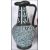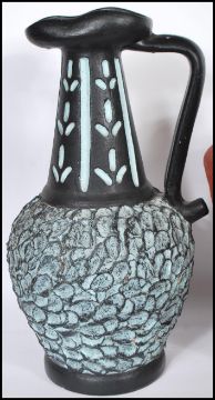 A group of three 20th Century studio pottery vases and a jug. One vase of tapering form having red ground and moulded decoration, the other of melon shape form with black and yellow glaze stripe decoration. Together with a large black and turquoise jug having decorative body and large handle.