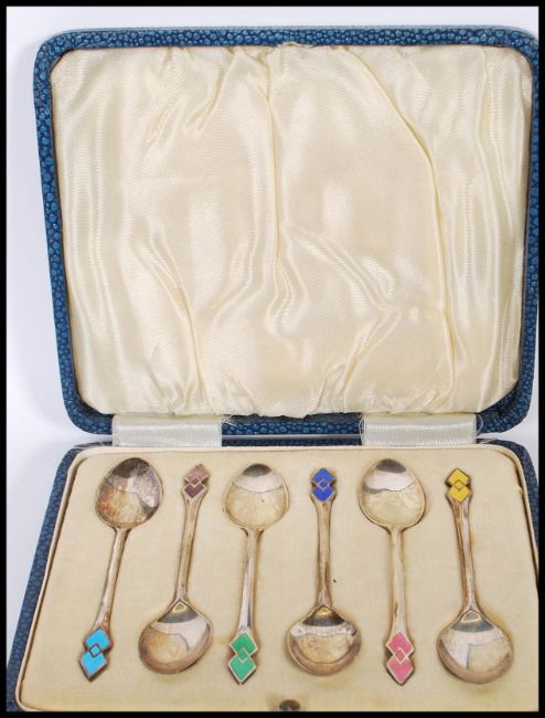 A set of six 1920's Art Deco silver hallmarked Turner & Simpson tea spoons having geometric enamelled finials of different colours, in original case. Hallmarked Birmingham 1936. Weight 36.0g.