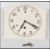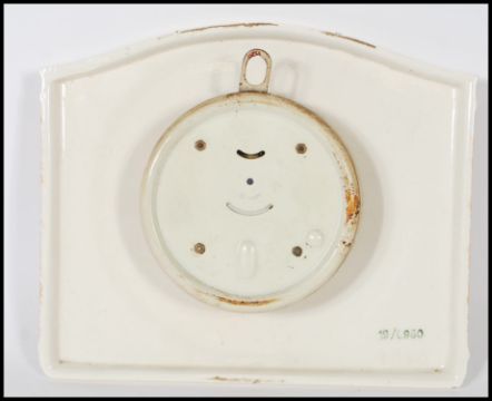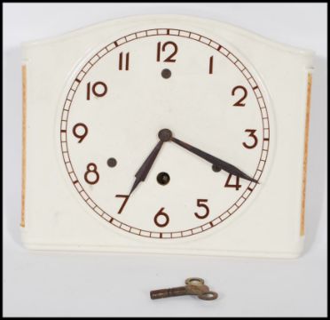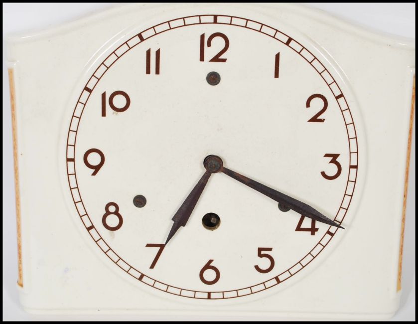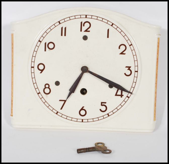 An early 20th Century Art Deco ceramic wall clock having a round face with arabic numerals to the chapter ring with brown painted mottled panels to the sides.