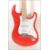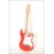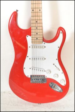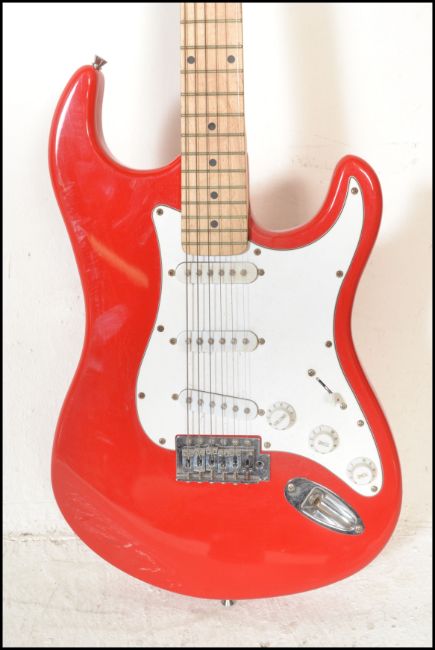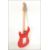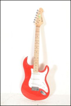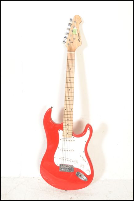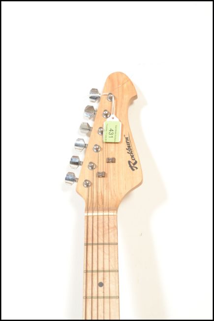 A vintage Rockburn electric six string guitar. The red body having white scratch guard with chrome tuning pegs and ebony fret markers.