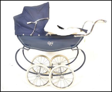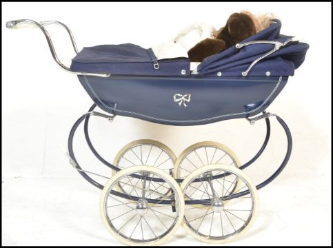 A vintage retro 20th Century Silver Cross childrens dolls pram finished in blue. The hooded pram raised on a chrome base and white wheels. Stamped Silver Cross to handle. Together with a puppet in the form of monkey and a doll.