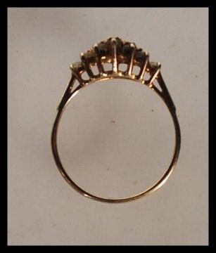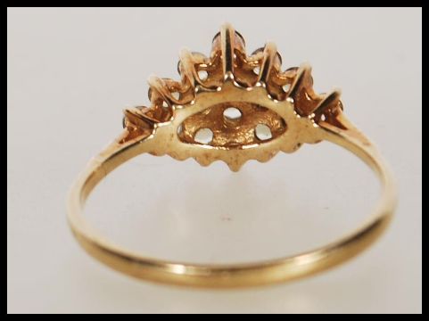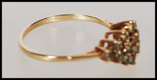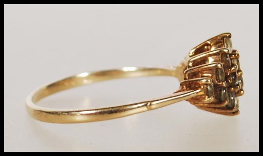 A stamped 375 9ct gold cluster ring set with round cut green stones to the head. Weight 2.5g. Size S.